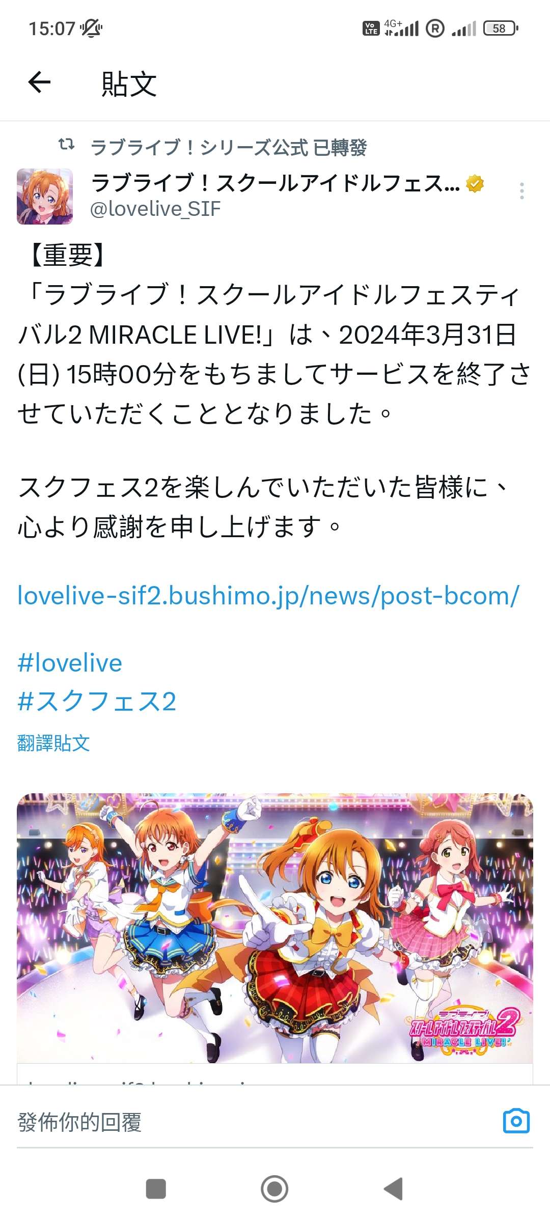 3.6「LoveLive!學園偶像祭2 MIRACLE LIVE!」將於2024年3月31日15:00停服結束營運。