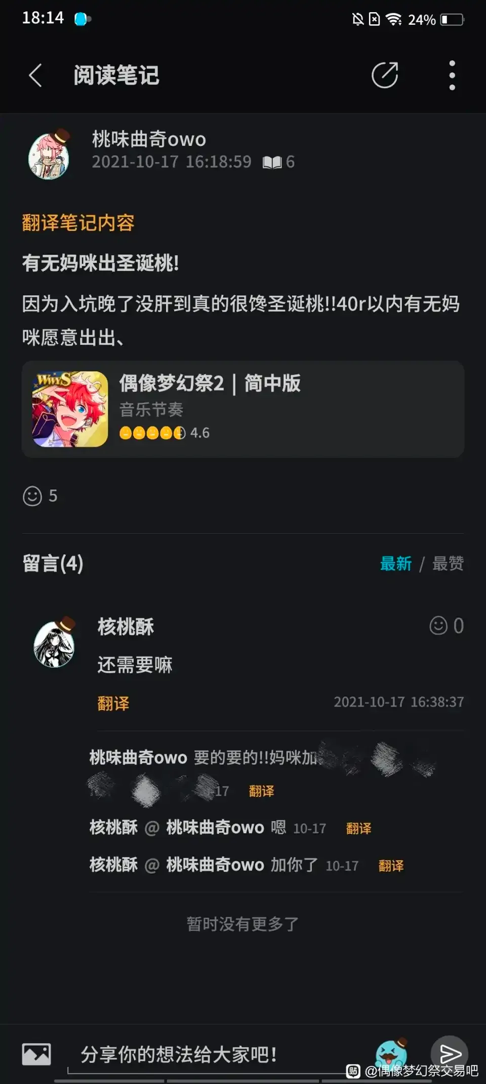 挂人 给大家避个雷 国日服两边都发一遍吧..昨天想收号没几分钟就有人回了,这个人到现在也没回,太馋圣诞桃就头铁 ,我人也傻没走交易平台 后来发现他发的图好像是盗来的,被骗了后悔都来不及。。以下聊天记录和骗子的vx号,就挂出来给大家避个雷吧,刚刚还看到它在评论区钓人现在装死删评、不要被牵着走了!!以后交易再也不头铁了.. 閲讀正文