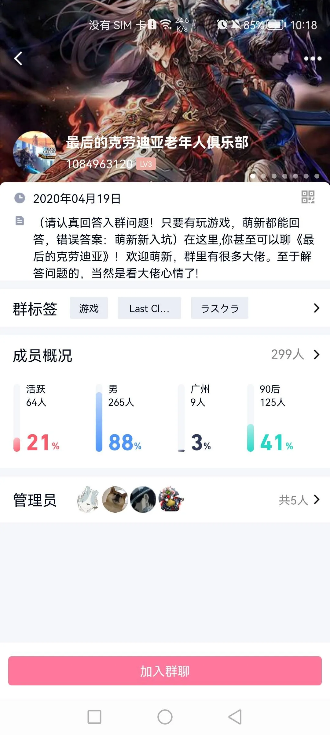 簡介: 玩你游别加群,日服高贵玩家优越感拉太满了,就是这个群里的一帮cs们玩个破游戏优越感拉满,避雷嗷,别加这种群,我已经受不了退了